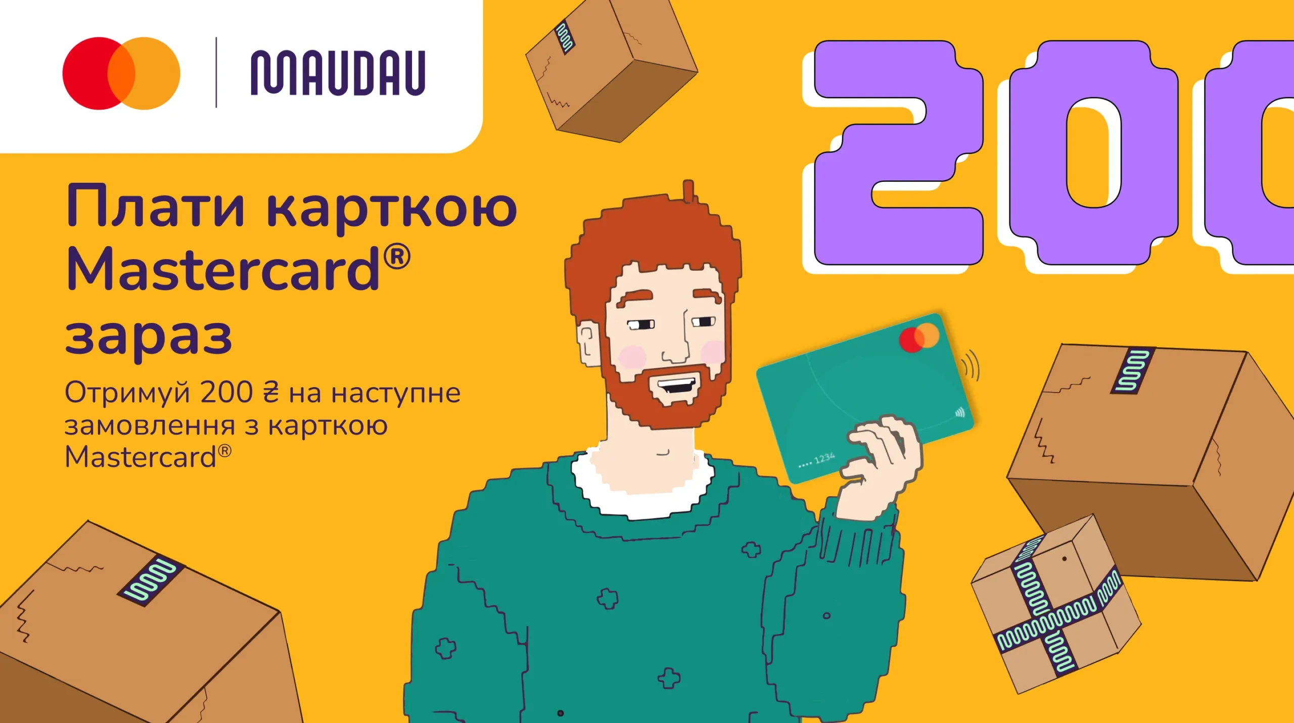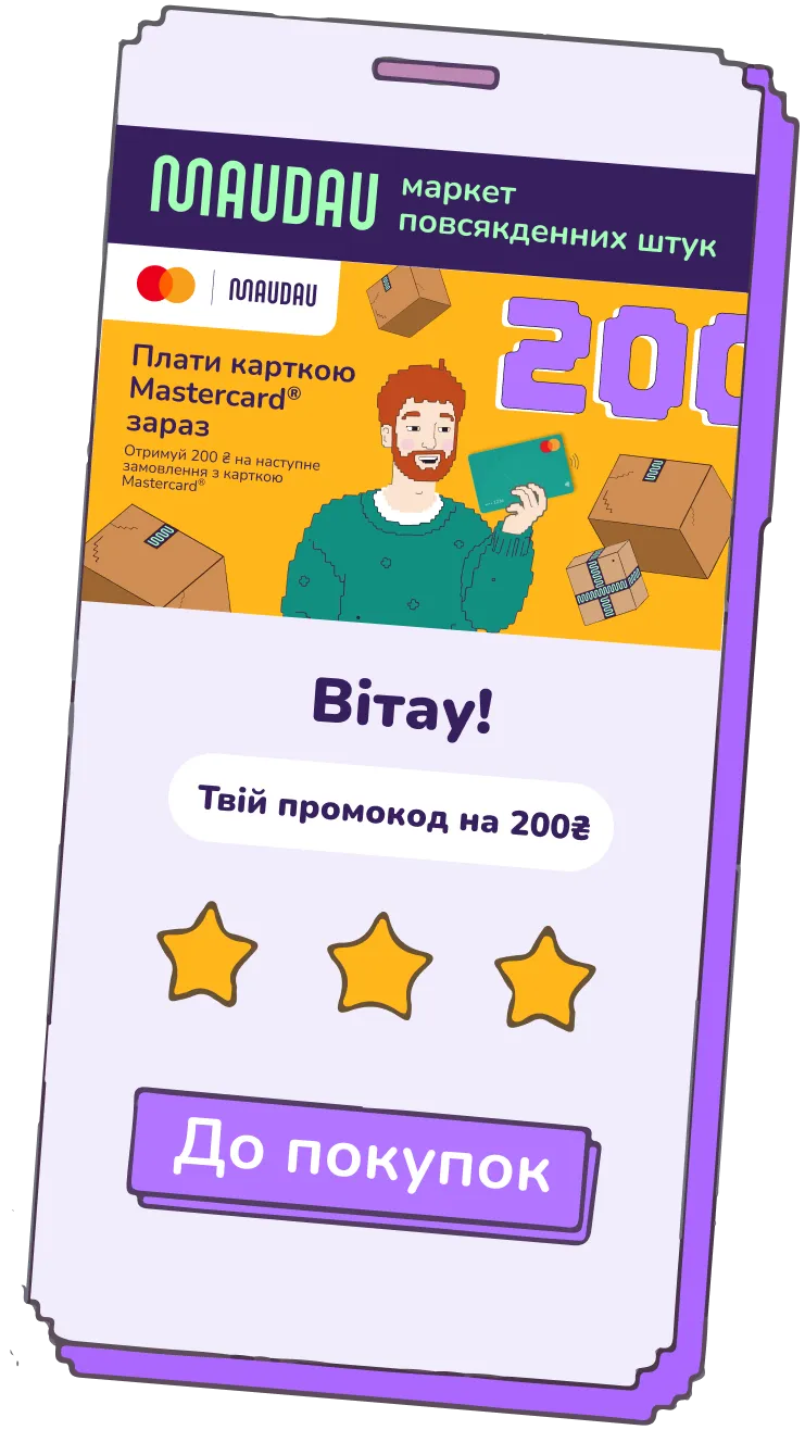 Промокод надає знижку 200 грн на наступне замовлення при оплаті карткою Mastercard® від 1500 грн (до оплати з урахуванням всіх акцій та промокодів)